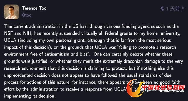 陶哲轩在一长串的推文中,沉重地表示:我的个人经费被暂停,确实造成了不小的影响。尤其是,为了能用先前NSF的拨款资助研究生度过这段时期,我已延迟领取夏季工资,如今也悬而未决了。如今,我几乎没有任何资源,来继续支撑团队的研究。而这还只是被冻结经费里很小的一部分。