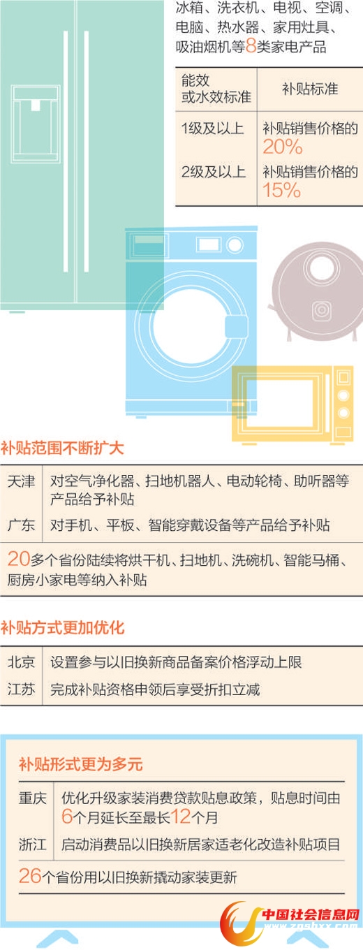 补贴范围不断扩大。广东制定实施方案,对个人消费者购买手机、平板、智能穿戴设备等3类产品给予补贴;天津出台补贴细则,新增对空气净化器、扫地机器人等家电、家装、家居和电动轮椅、助听器等适老化产品的补贴。