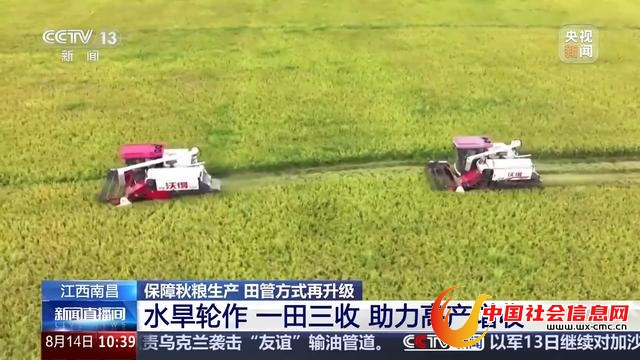 在江西南昌联圩镇,一茬茬饱满的稻穗被迅速收割、脱粒,装入运输车辆。而在收割机作业的田块旁,翻耕起垄机正加紧作业,农户们忙着清沟除杂、整理田地,为播种优质高产大豆做足准备。今年当地采用水旱轮作、一田三收的种植方式,春季种水稻,初秋收完水稻后抢种大豆,秋末大豆收获后紧接着种植耐寒蔬菜或油菜,三季作物茬口紧密衔接,全年无闲田。同时,通过推广良种、测土配方施肥等技术,确保每种作物都能优质高产。
