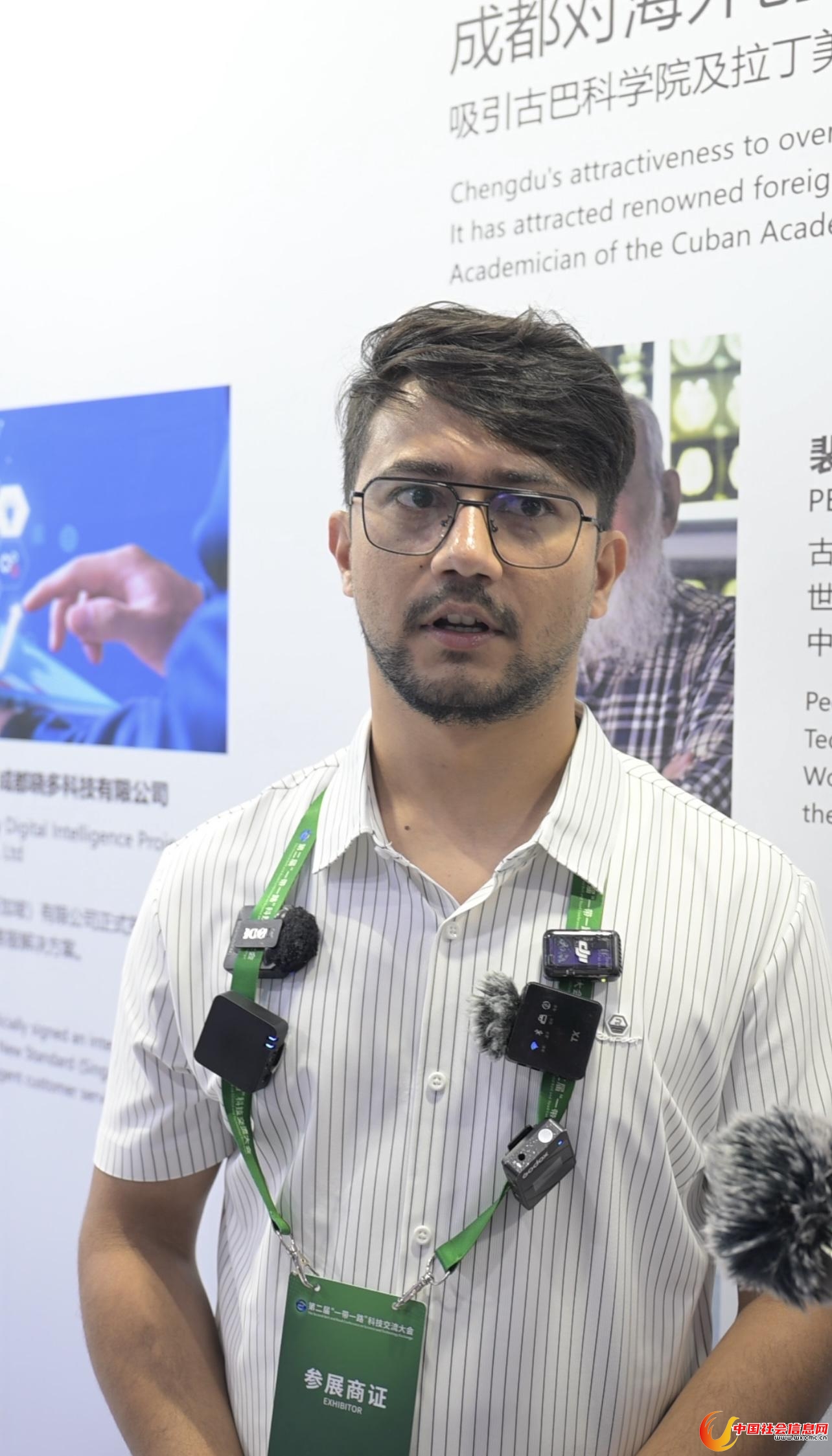 在成都馆,中国-古巴神经技术与脑器交互“一带一路”联合实验室前,实验室研究助理Sambhu Pandit正在展台演示着带来的参展品。虽无炫目场景,却因其开放式研究计划与优质成果,吸引了不少高校的教授、科研者驻足。