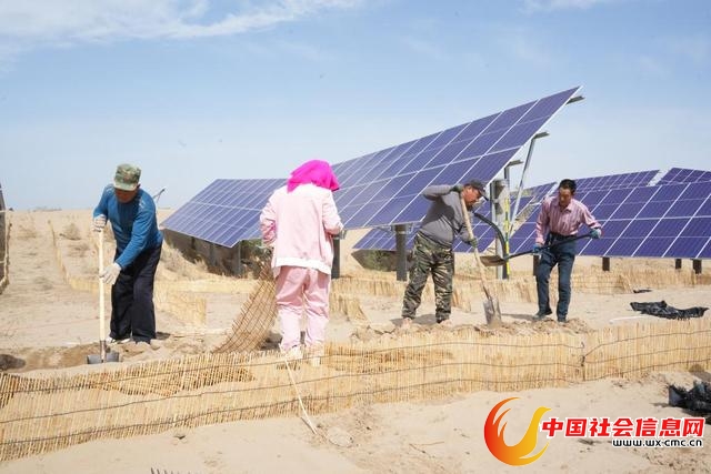 连日来,地处黄河“几字弯”北岸的巴彦淖尔市临河区新华林场光伏治沙项目区机器轰鸣,新华镇隆光村村民吴瑞喜和其他村民利用夯土机打地基。“现在,我们种的小麦刚抽穗、玉米已浇水,村民们趁着农闲到这里打工,一天能挣300元,大家参与防沙治沙的积极性都很高。”吴瑞喜说。