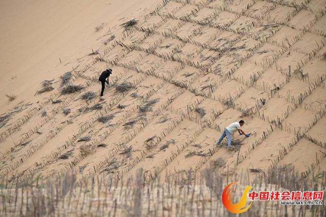 鄂尔多斯市达拉特旗农民在防沙治沙项目区铺设沙障。新华社发(杨耀中 摄)