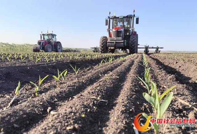 2025年5月23日,在北大荒集团黑龙江建设农场有限公司第三管理区,农机工人驾驶搭载北斗卫星导航自动系统的大型中耕深松机械,对刚出苗的玉米地块进行深松放寒作业。新华社发(许颖献摄)