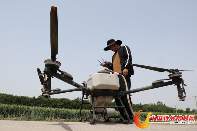 2025年5月7日,在河南省焦作市温县祥云镇古贤村,村民为植保无人机添加药液开展“一喷三防”。新华社发(徐宏星摄)