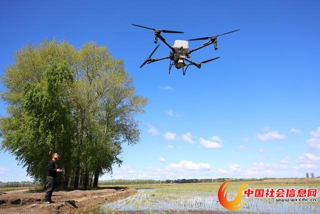 2025年5月21日,在北大荒集团黑龙江绥滨农场有限公司东井管理区,操作员操控搭载北斗导航系统的植保无人机,对即将施返青肥的地块进行打点。新华社发(李兴摄)