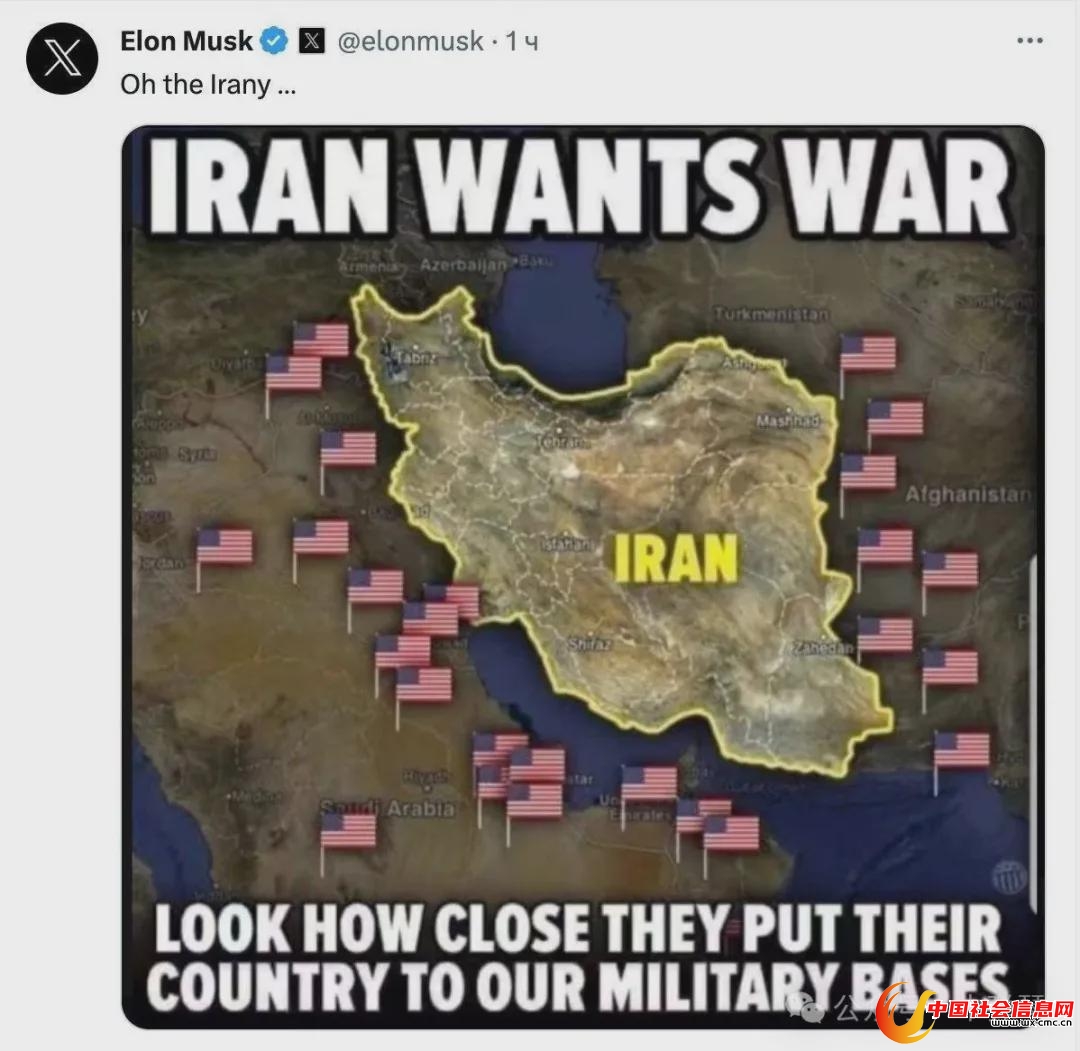 马斯克之前就转发过一张图,伊朗周边到处是美国军事基地(有些未必对),配文是:伊朗想要战争,看看他们把国家放到了离我们军事基地多近的地方……
