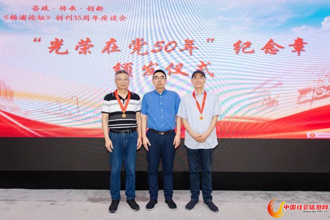 在庄重的致敬时刻,区委党校常务副校长、《杨浦论坛》主编杨春雷向党龄满50年的徐松亮、曾麟两位同志颁发了“光荣在党50年”纪念章。熠熠生辉的纪念章既承载着他们对党校事业的忠诚奉献,也象征着党的理论阵地——《杨浦论坛》的薪火相传。