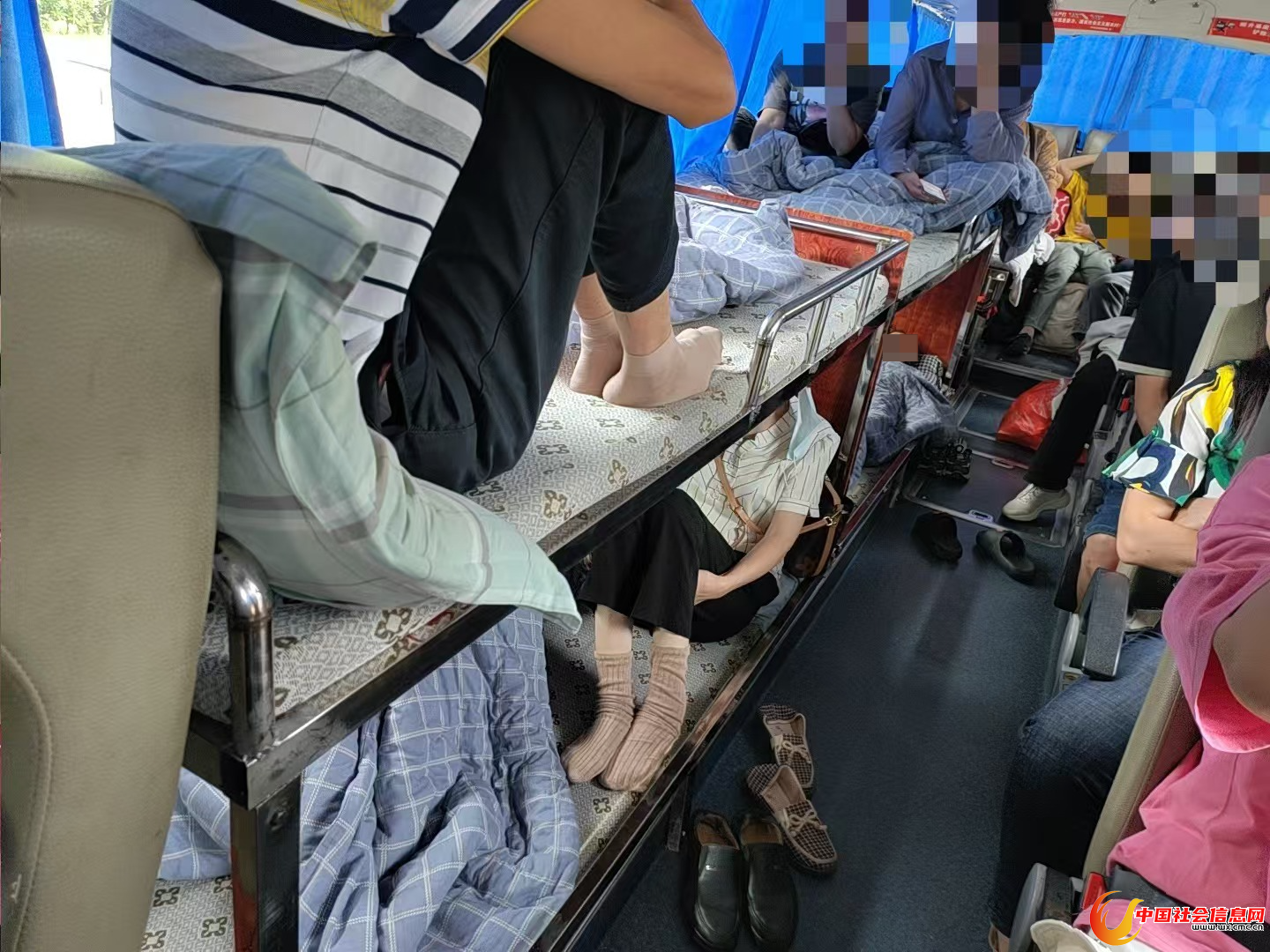 民警上车检查时惊讶地发现,这辆核载54人的大型客车,车厢里除了正常的客车座位之外,其左侧后端的部分座位竟然被卸掉,换成了用不锈钢制作的上下铺床位,数名乘客或坐或躺在“床”上,随车前往目的地。