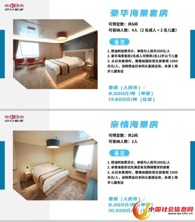 需要注意的是,每位旅客还需要支付单程200元的燃油附加费。从日本返回时,2岁以上的旅客每人需缴纳1000日元的国际观光旅客税。如果旅客购买往返船票,不同房型会有不同程度的价格优惠。
