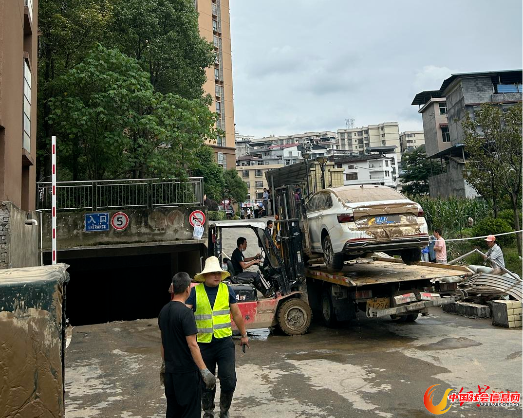 洪水过后,二手车回收商家在龙领国际小区石道的石板上,贴上了“高价回收水淹车”的广告。6月21日起,地下车库被泡水的汽车一辆接着一辆被叉车拖出,再转运到小区外的停车场,等待定损。