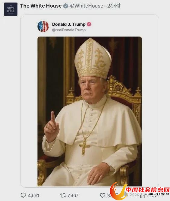 比如,罗马教皇去世后,他干脆贴出了一张AI图片,他成了新的罗马教皇。白宫官号还转发了。