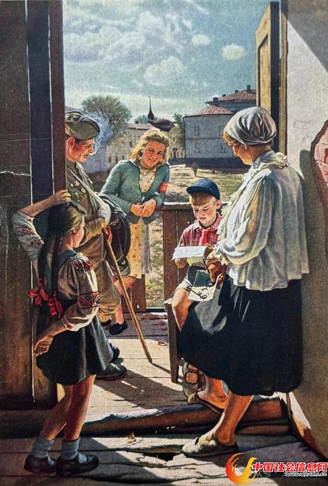 《前线来信》画的是卫国战争期间,后方城市一扇敞开的房门前,两个孩子、一位年轻母亲、一位老妇人、一位受伤的士兵,正在读一封信。阳光明媚,笑容满脸,显然是孩子的父亲传来了胜利的消息。画中那位背对着的老妇人,稍稍侧一点脸,就让人看出了笑意。逆光效果,颜色艳而亮,似受印象派影响。尽管那时中苏关系紧张,可在一般老百姓心目中,苏联仍是美好的向往。我小学同窗杨克,妈妈是苏联人,三年级时他去莫斯科读了一年,回来后带奶糖分给大家,好吃极了!
