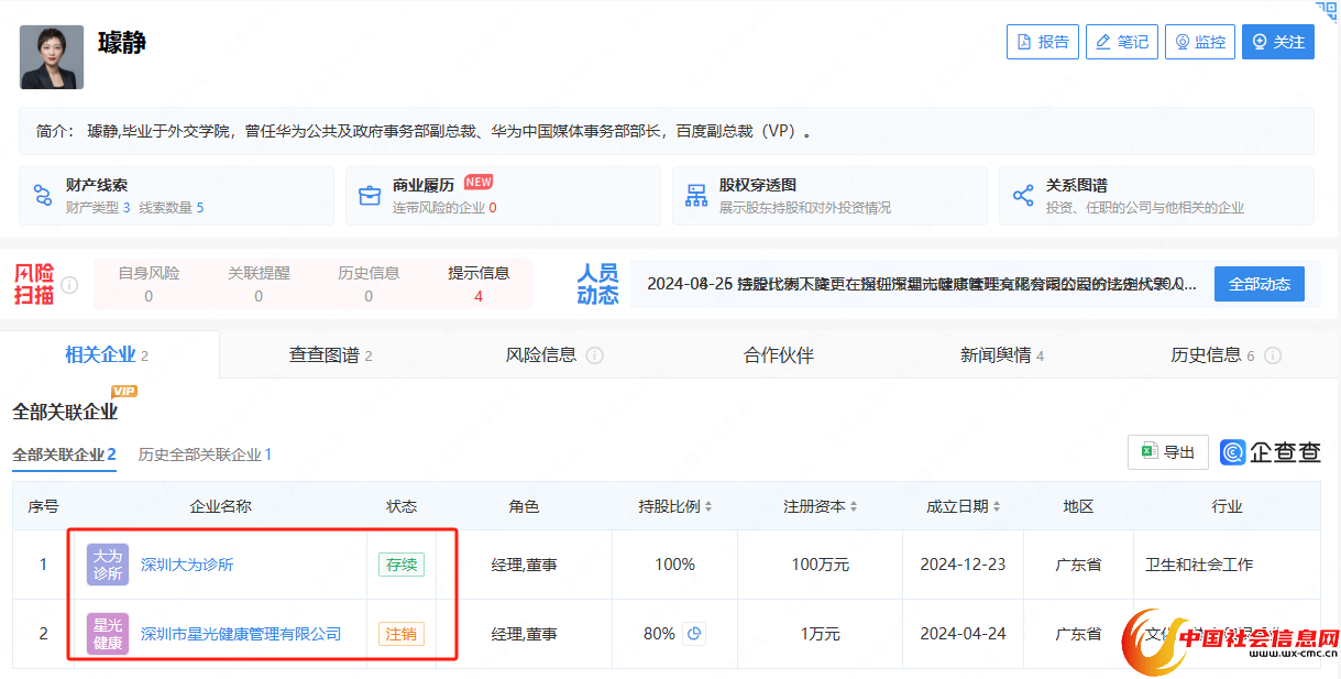 企查查显示,璩静名下新增一家存续企业——深圳大为诊所。该诊所成立于2024年12月23日,璩静持股比例为100%,认缴出资额为100万元,经营范围为诊所服务等。企查查显示,根据璩静关联的任职历史,她曾任深圳市星光健康管理有限公司(以下简称“深圳星光健康”)的董事、经理,目前该公司已注销。据九派新闻报道,百度前副总裁璩静的确曾在深圳星光健康任职。