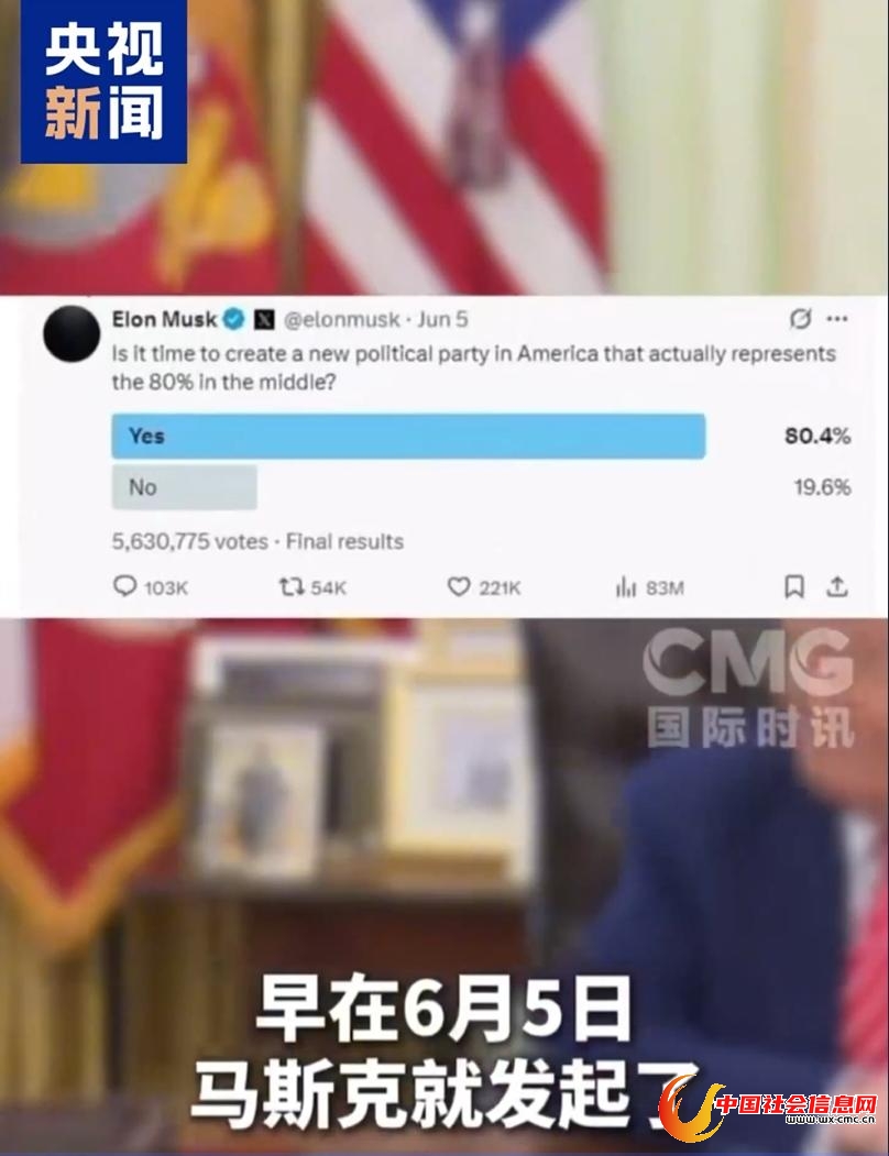从萌发成立新政党的时间线来看,马斯克于6月5日首次提出这一想法。他在社交平台上发起投票,问大家是否同意“是时候在美国创建一个真正代表80%中间派的新政党”。结果迎来563万次投票,其中80.4%的票表示支持。随后,马斯克表示赞同一粉丝提出的党名建议——“美国党”。