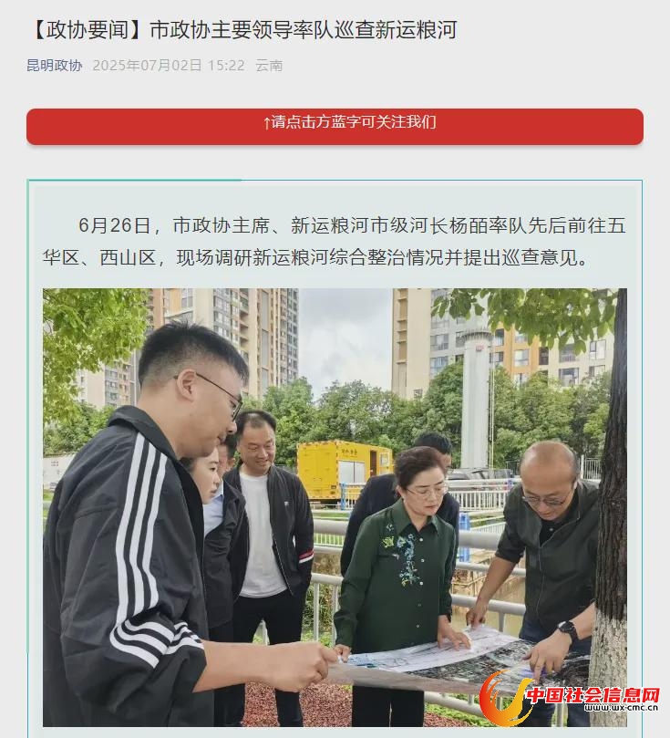 据“昆明政协”官微7月2日消息:6月26日,杨皕还曾率队先后前往五华区、西山区,现场调研新运粮河综合整治情况并提出巡查意见。