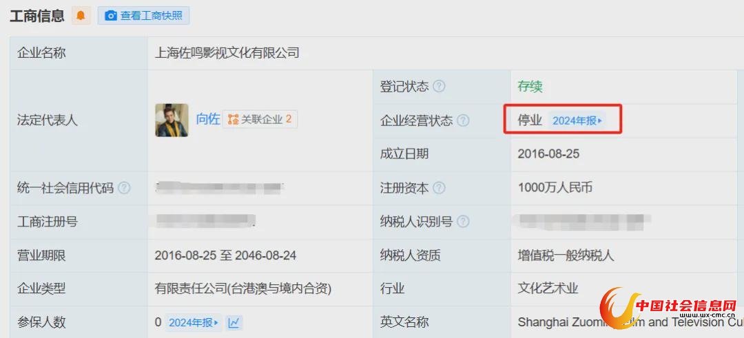 其中,上海佐鸣影视文化有限公司成立于2016年8月,注册资本1000万元人民币,向佐担任该公司董事长、法定代表人,持股70%,目前该公司虽存续,但已为停业状态。