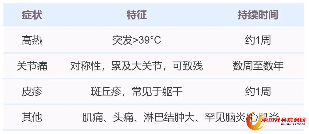 基孔肯雅热的潜伏期一般为1-12天,多为3-7天。常见症状为: