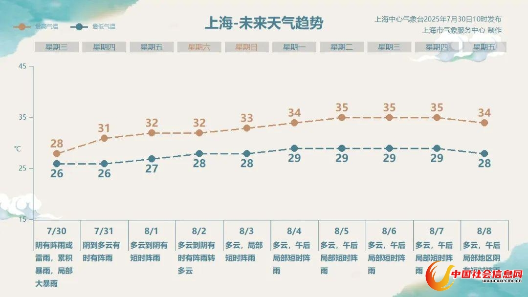 今天气温在26~28℃之间。明天白天最高气温再度上升至31℃,湿度大、气压低,体感潮湿闷热。