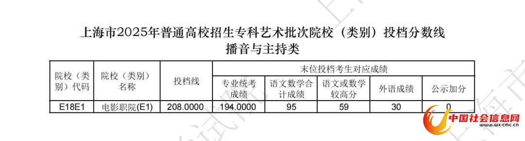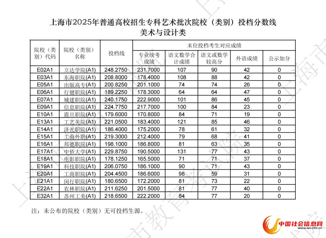 沪2025年专科艺体类批次院校(类别)投档分数线公布
