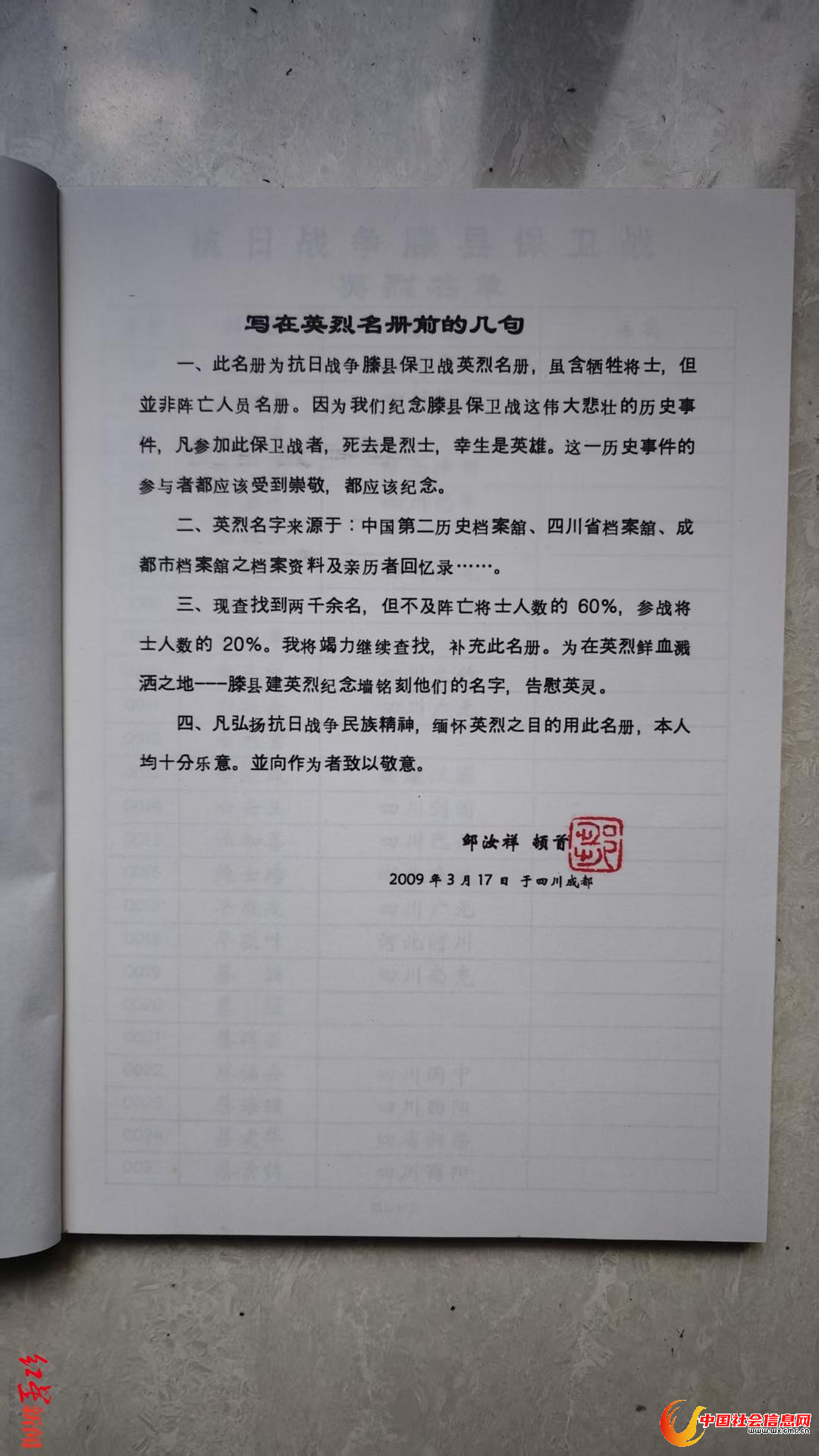 在邹汝祥离世前,已完成滕县保卫战中2160名英烈(部分)名单收集,并将滕县英烈资料编撰成《抗日战争滕县保卫战英烈名册》。此后,这份名单连同他翻拍的邹绍孟家书照片一起被捐给建川博物馆之川军抗战馆以作永久纪念。