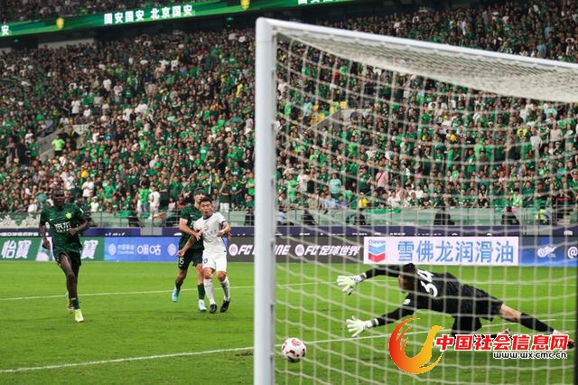 7月19日,北京国安队守门员侯森(下)未能成功扑出上海申花队球员于汉超的射门。 新华社发(那宇奇摄)