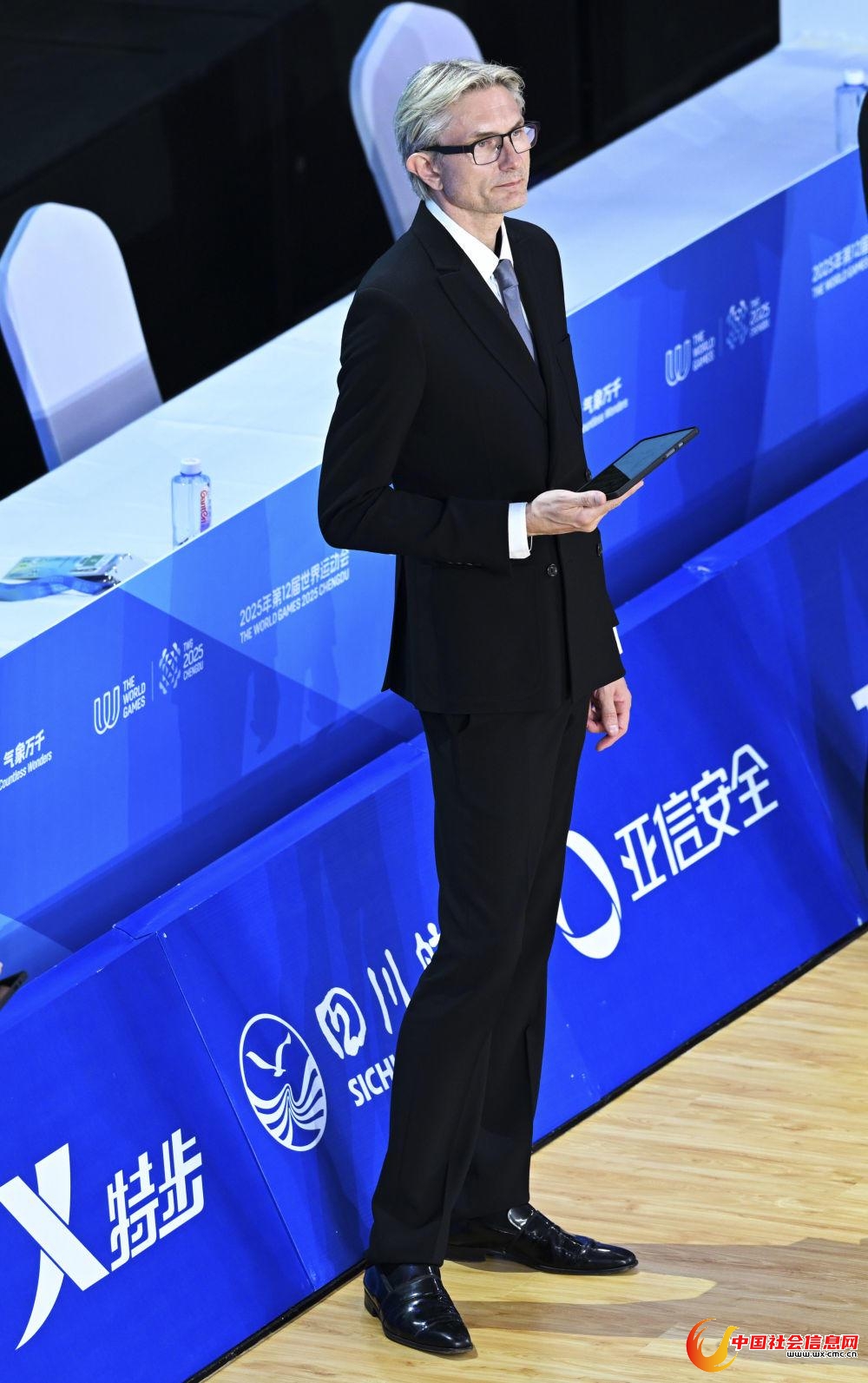近日,成都世运会体育舞蹈比赛在城北体育馆精彩上演。聚光灯之外,场边的一位裁判意外成了社交平台上的热门人物。1米91的个子,背脊笔直,站姿如雕塑般挺拔。举手投足间优雅从容的气质,让55岁的拉脱维亚裁判辛金斯在赛场外迅速“火出圈”。