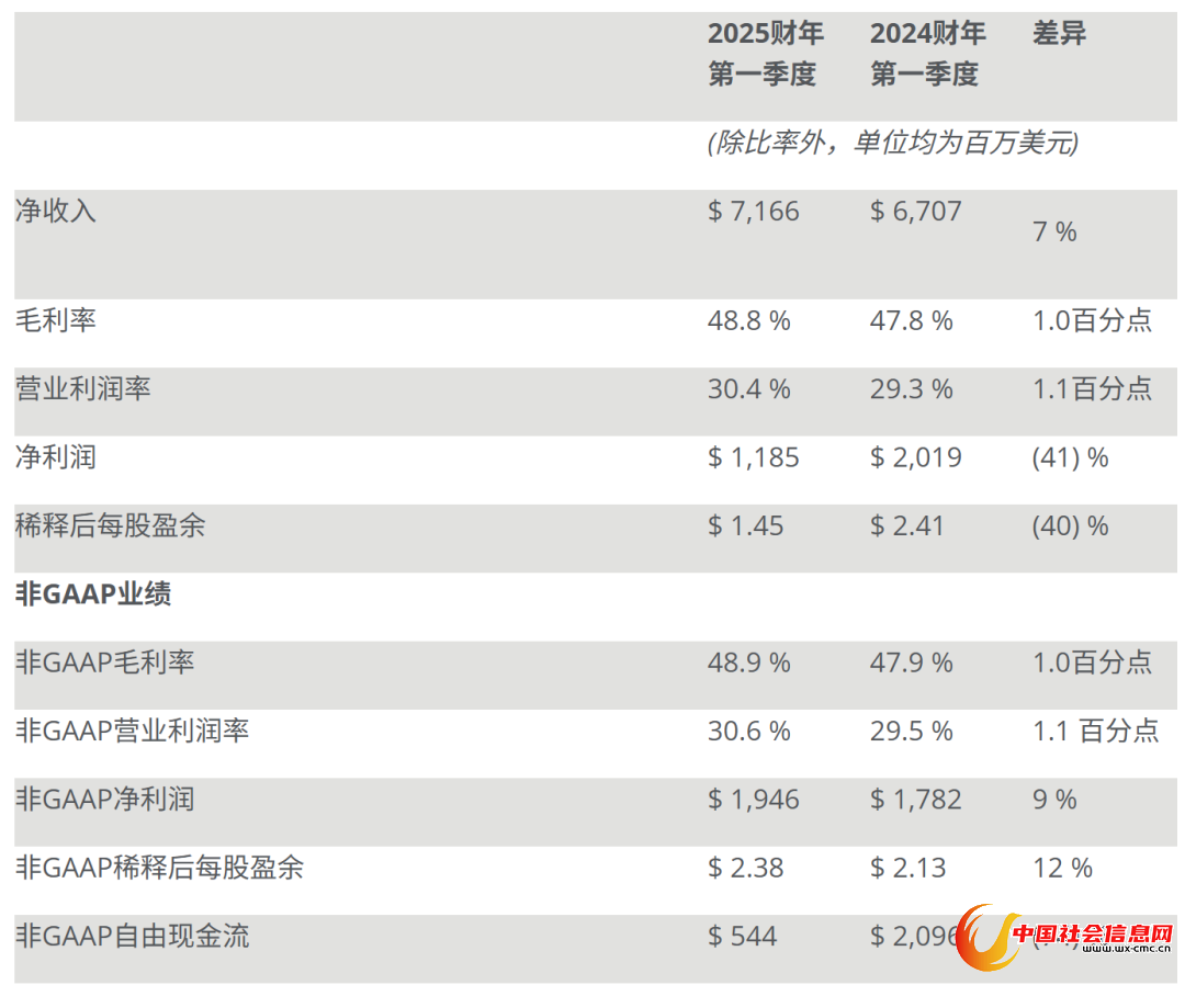 该公司官网显示,2025财年第一季度,公司营收71.7亿美元,同比增长7%,净利润11.85亿美元,实现经营活动现金流9.25亿美元,GAAP营业利润率30.4%,非GAAP营业利润率30.6%。