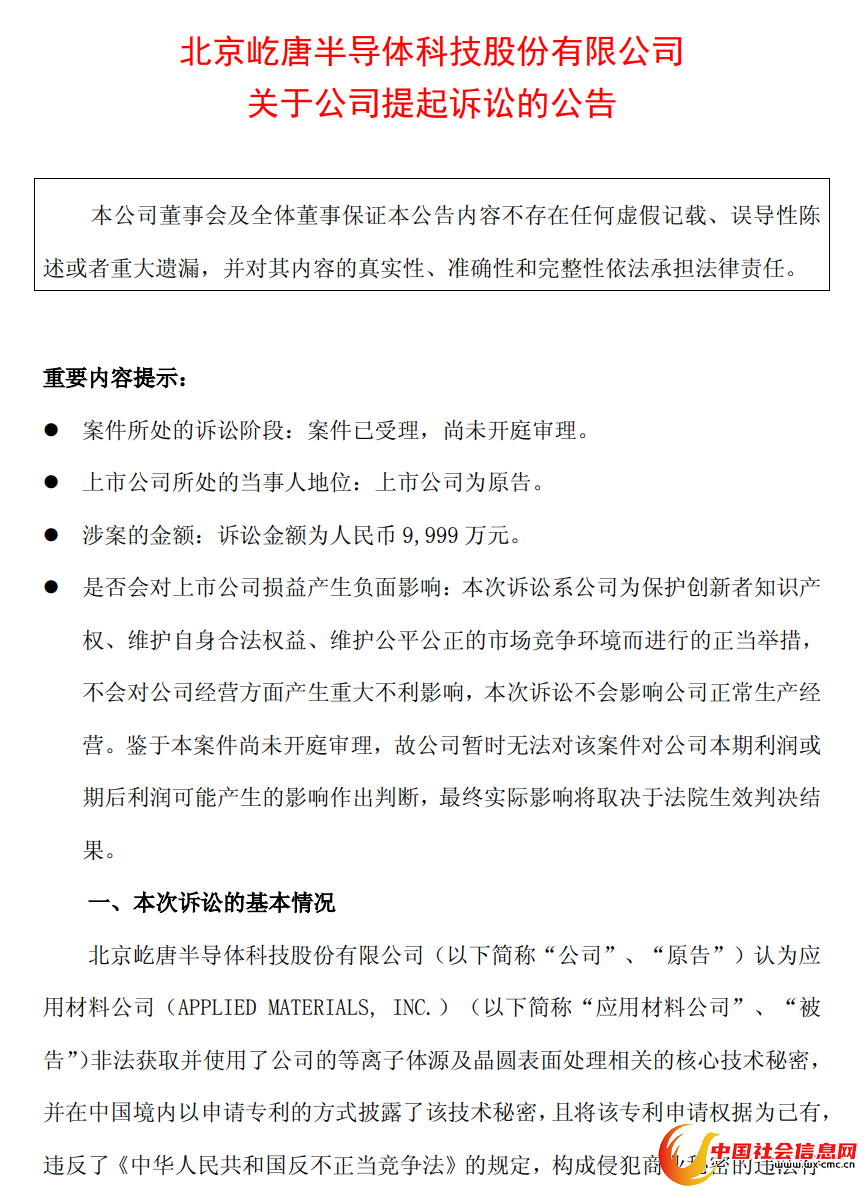 8月13日,北京屹唐半导体科技股份有限公司(以下简称“屹唐股份”)公告称,公司因认为应用材料公司(APPLIED MATERIALS, INC.)非法获取并使用了公司的等离子体源及晶圆表面处理相关的核心技术秘密,在中国境内以申请专利的方式披露了该技术秘密,且将该专利申请权据为己有,违反了《中华人民共和国反不正当竞争法》的规定,构成侵犯商业秘密的违法行为,向北京知识产权法院提起诉讼,诉讼金额为人民币9999万元。