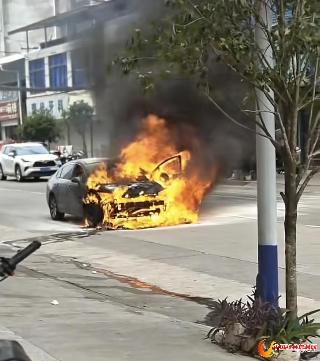 网上流传的多段相关现场视频画面显示,起火车辆是一辆小轿车,被熊熊大火包围并冒着黑烟。消防救援人员赶到现场将火势扑灭,最后车辆只剩空壳。