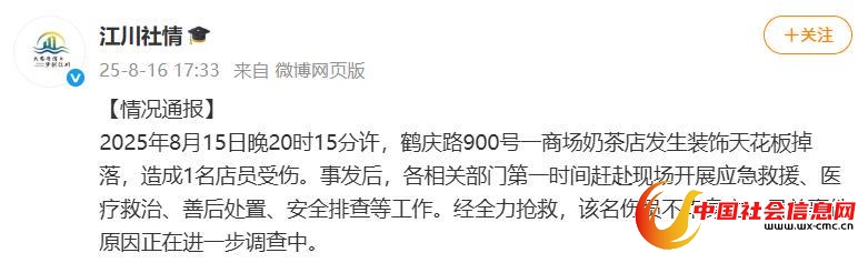 2025年8月15日晚20时15分许,鹤庆路900号一商场奶茶店发生装饰天花板掉落,造成1名店员受伤。事发后,各相关部门第一时间赶赴现场开展应急救援、医疗救治、善后处置、安全排查等工作。经全力抢救,该名伤员不幸身亡。目前事件原因正在进一步调查中。