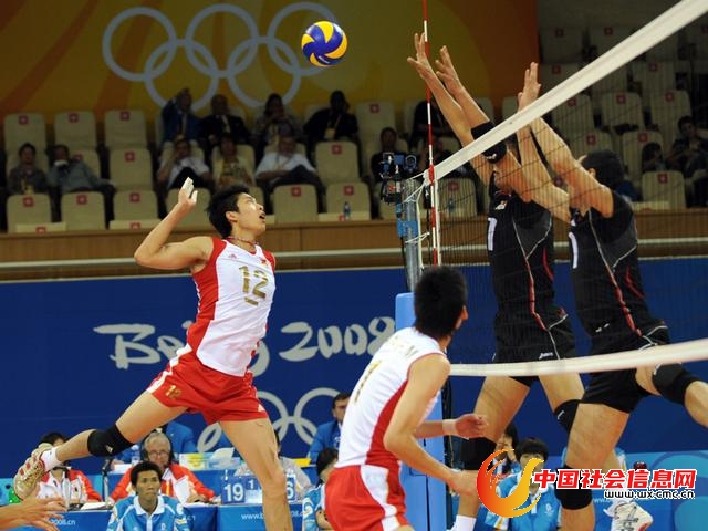 北京奥运会上,中国男排战胜日本男排晋级淘汰赛,图为沈琼在比赛中吊球