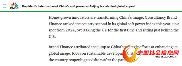 文章说,英国“品牌金融”咨询公司今年发布的全球软实力指数显示,中国排名升至全球第二——较2024年上升一位,首次超越英国,目前仅次于美国。该公司分析认为,中国软实力跃升的重要原因在于中国提升国际形象的战略性举措、对可持续发展的坚定投入、日益增强的品牌实力,以及向全球游客敞开国门。消费分析师认为,经过这些努力,人们终于能穿透贴在中国产品身上的负面滤镜,看清产品的真正价值,逐渐摆脱过去对“中国制造”的刻板偏见。