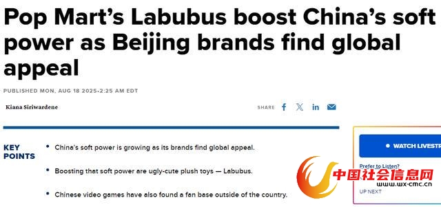 文章举例说,中国咖啡连锁店在纽约遍地开花,中国电子游戏营收数十亿美元,中国美妆(也称“国潮美妆”)企业正向全球市场扩张,“拉布布”玩偶无处不在,吸引了全球数十万粉丝的关注;《黑神话:悟空》《原神》等中国游戏在全球拥趸众多。