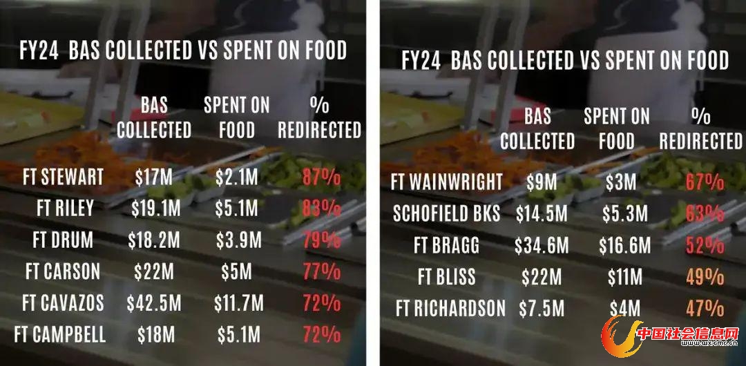 红字部分为美陆军各基地挪用的伙食费比例