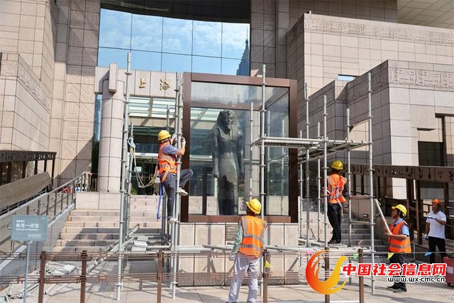 今天上午8时,上海博物馆人民广场馆南门美内普塔雕像开始拆除外罩。随着古埃及文明大展的落幕,这尊高2.4米、重达2吨多的法老雕像圆满完成了它的“上海出差”任务。