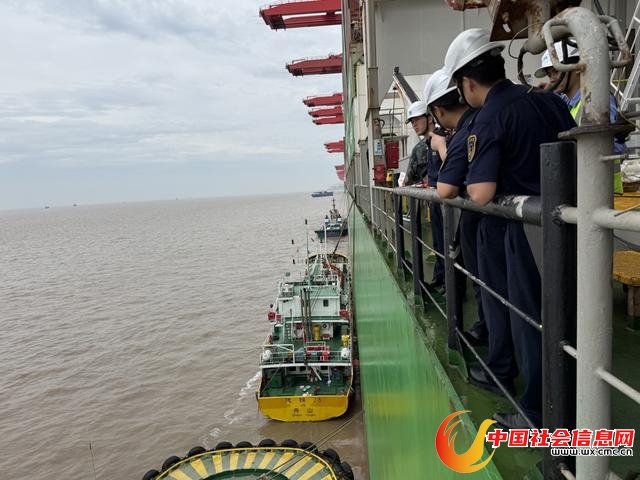 在洋山港海事局的远程监控和现场保障下,历时约9个小时,大型集装箱船“长顶”轮在洋山港盛东码头完成全球首次船对船液态二氧化碳接卸作业。