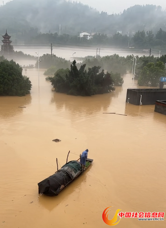 从杨女士拍摄的照片中可以看到,就建在江边的“村超”体育场已经被彻底淹没,周围的道路上也全部被淹,水深基本要没过很多周边建筑的一层。“有的居民已经划船在市区内寻找可能被困的居民了,船几乎和屋顶齐平了。”杨女士说。