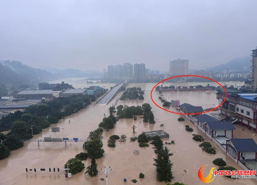 ▲榕江部分城区遭遇洪水(红圈处为村超体育场) 受访者供图