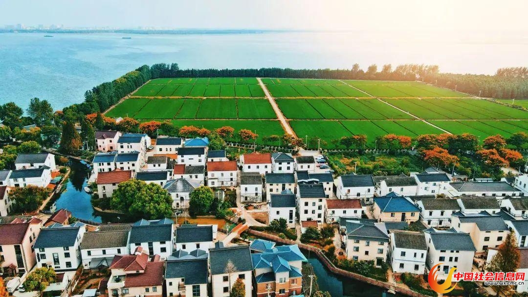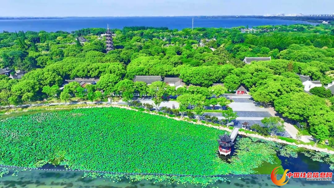 成片的荷塘和岸上的房屋相互映衬,成就一幅浓墨重彩的江南水乡画卷。