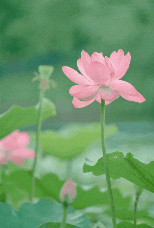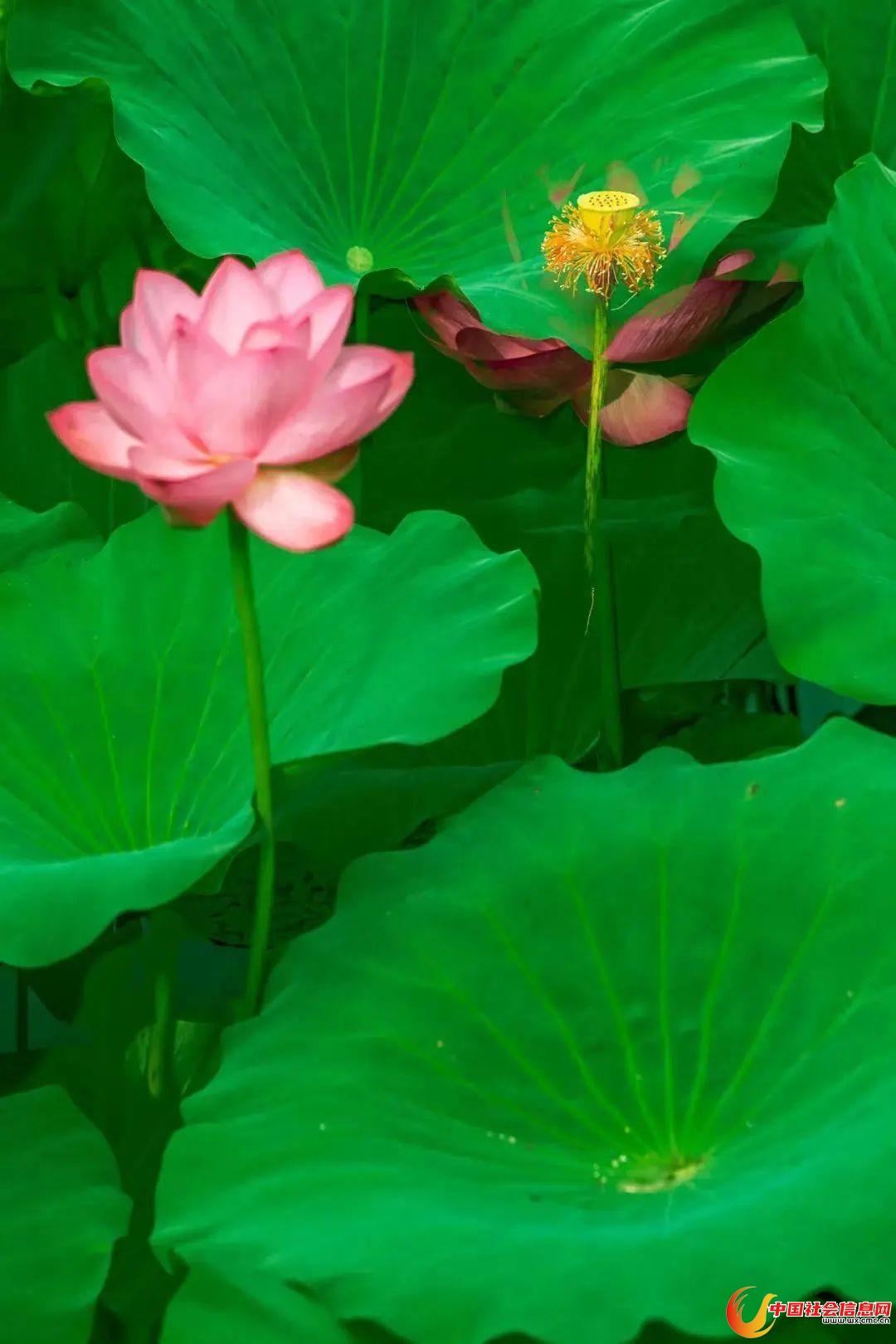 蜻蜓时而在水面上低飞掠过,时而俏皮地停驻在待放的花苞尖上,还有水鸟迈着优雅的步子,在浅水区和荷叶间逡巡,为这幅宁静的夏日荷塘图增添灵动的气息~