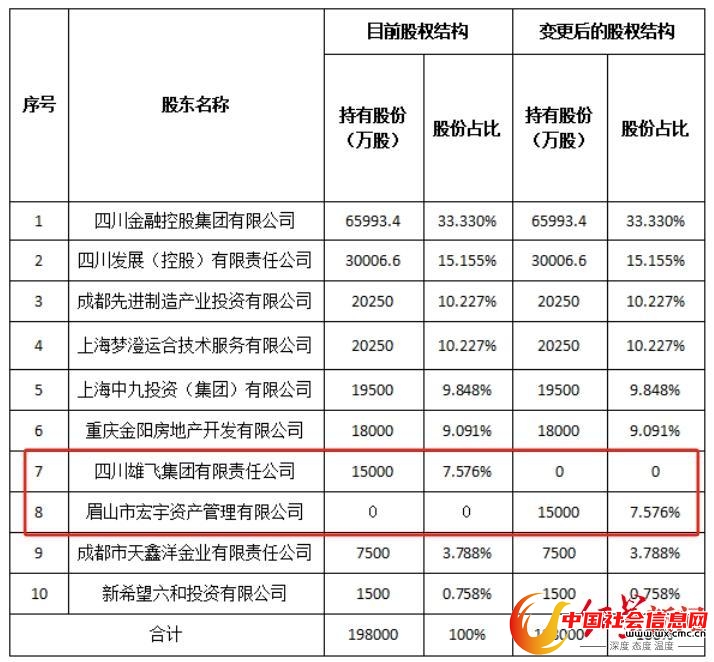 6月20日,国宝人寿公告显示,眉山市宏宇资产管理有限公司(下称“眉山宏宇”)通过参与公开拍卖竞拍的方式,以起拍价1.76亿元竞得四川雄飞集团有限责任公司(下称“四川雄飞”)所持公司1.5亿股股份。此前,四川雄飞被裁定进入破产重整程序。