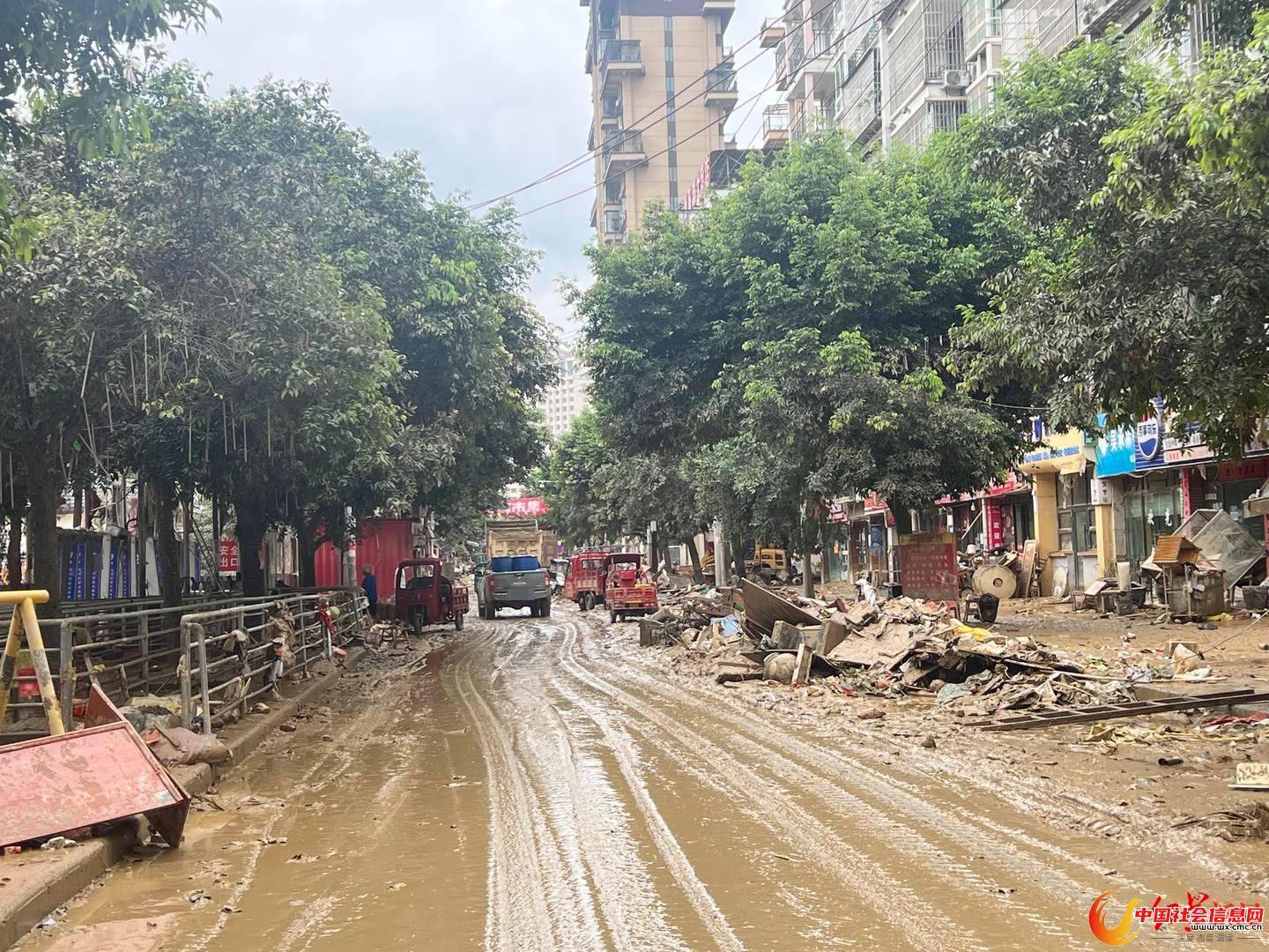 路边有一些被洪水淹没过的车辆,临街门店清晰地留着被洪水侵袭过的水位线和点点淤泥,清理出来的垃圾还堆在路边,有商户在路边进行整理,也有不少民众自发地进行着清理工作。