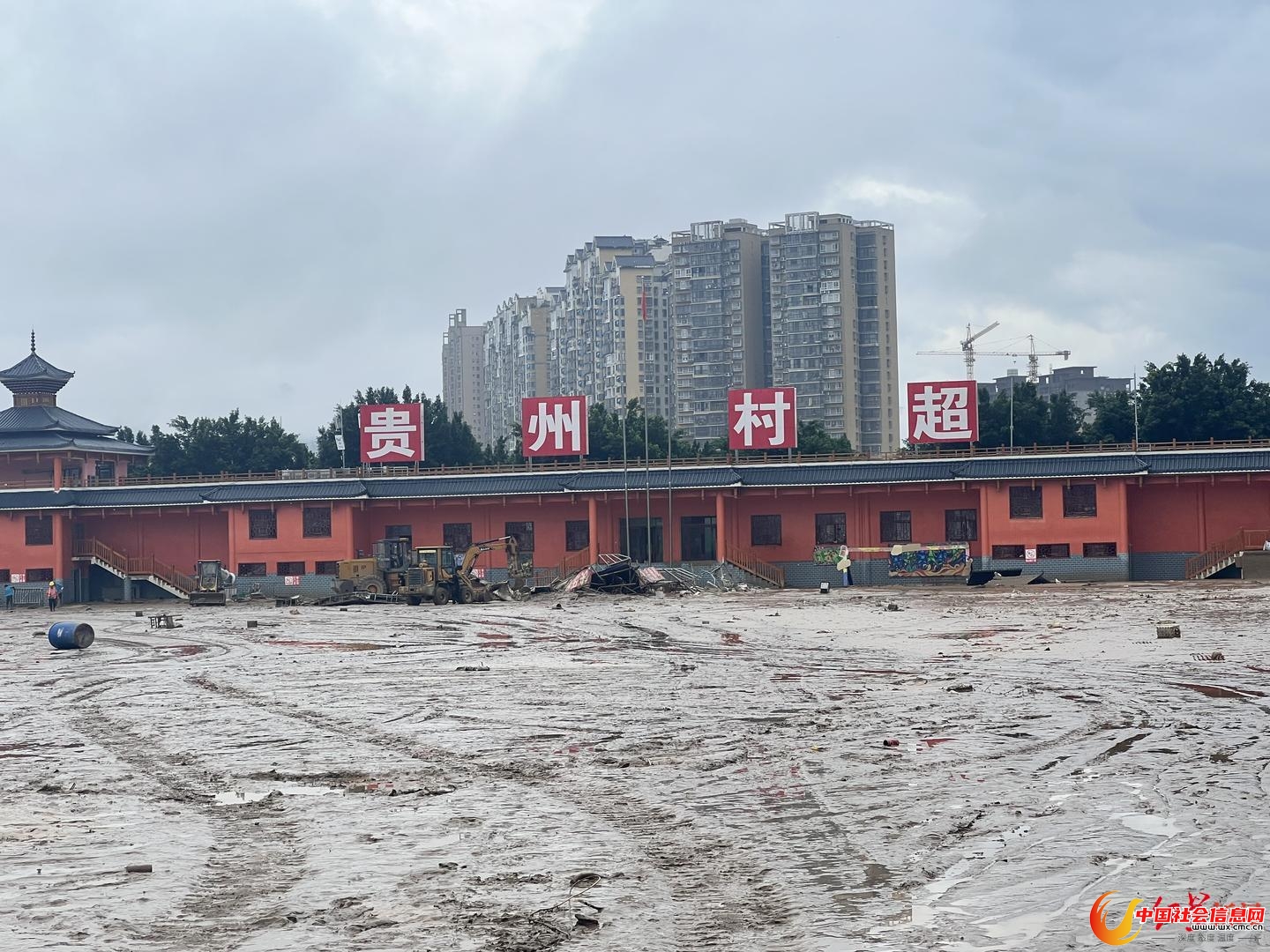 在榕江县闻名全国的村超球场,红星新闻记者看到,这里的球场已经完全被淤泥覆盖,周边高处的看台也有明显的水迹。现场有多辆清淤车辆在进行作业,也不停有新的车辆出入。