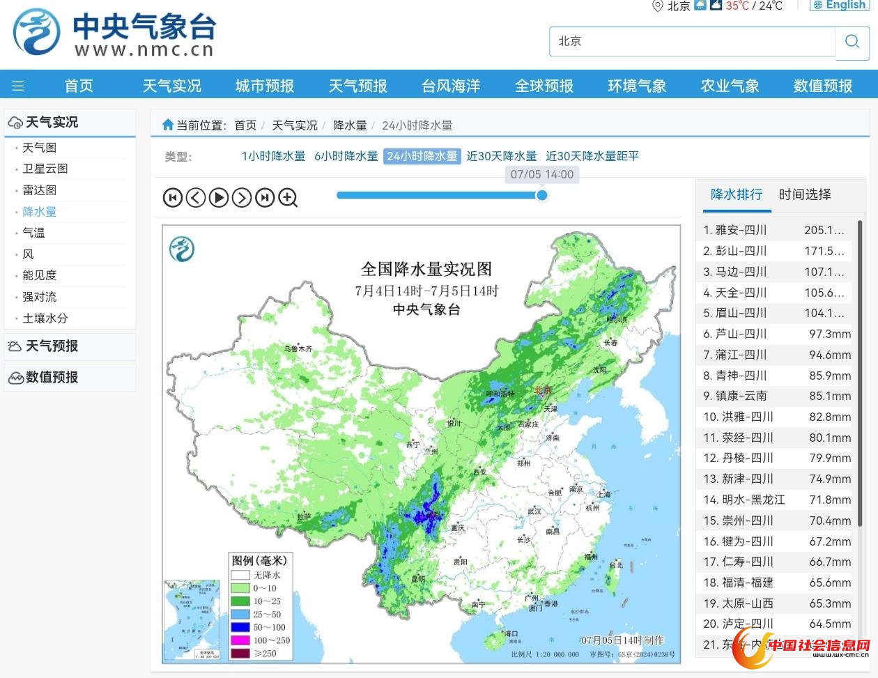 7月5日15时许,红星新闻记者了解到,据中国气象局·天气预报网站实况排行榜显示,过去24小时,雅安降水量205.1mm,排名全国第一,昨天傍晚到夜间雅安市普降大到暴雨局部大暴雨,大暴雨落区在雨城、天全、芦山、荥经、汉源和石棉。