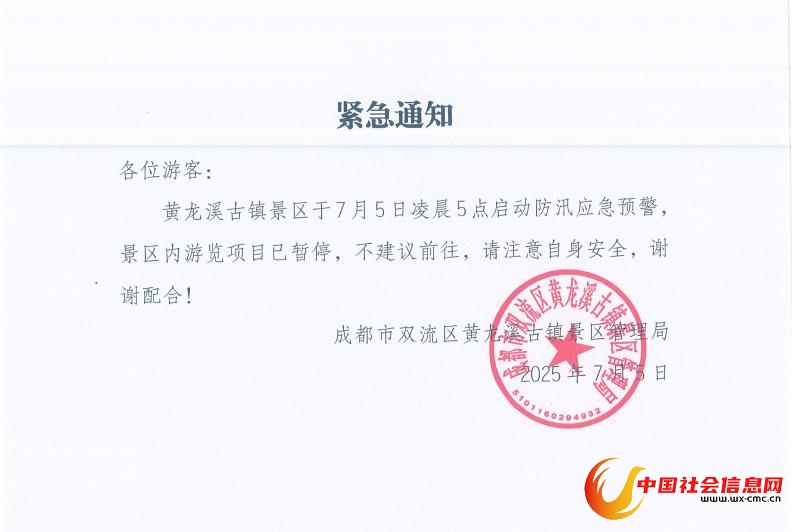 7月5日,黄龙溪古镇景区微信公众号发布消息,黄龙溪古镇景区于7月5日凌晨5点启动防汛应急预警,景区内游览项目已暂停,不建议前往。