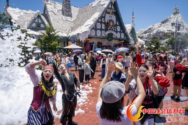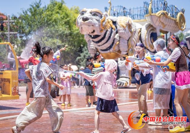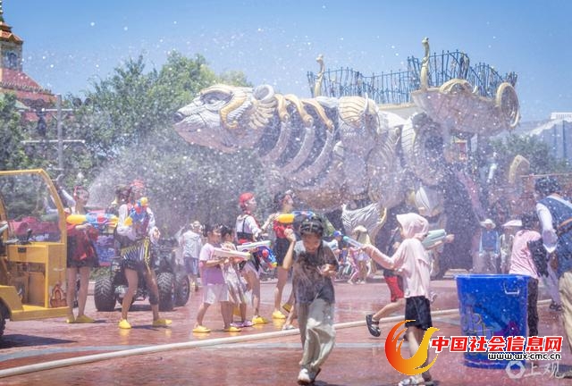 中午时分,游客们在极地小镇享受园内组织的泼水活动,欢笑声与水花交织,尽享戏水狂欢。