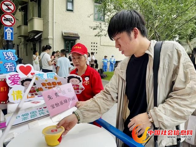 其中不乏大老远赶来的老居民。潘正玉曾在附近住了60年,经置换搬迁去了银都路。今天清早,为了帮衬着送清凉,她早上5点不到就起了,路上倒两辆公交车,花上1个半小时,赶在摆摊前到了。潘阿姨心里有衡量,觉得值:“人搬走了,但感情放不下。就当回去看看老街坊邻居。”