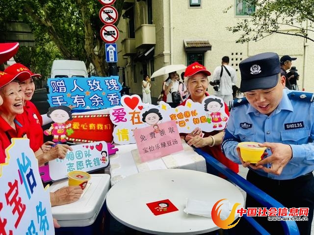 今天上午9点刚过,上海直接拉响了高温橙色预警,气温节节攀升。武康大楼前,白晃晃的水泥地照得人睁不开眼,一天中最热的时段将至,却有一群头发花白、身着红色T恤的志愿者阿姨挑在这个点开摊,把一碗碗冰镇绿豆汤送上街头。这些,全是免费的,为的就是慰劳烈日下的人。