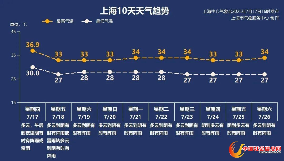 7月19日(周六):多云到阴有时有阵雨,28~33℃
