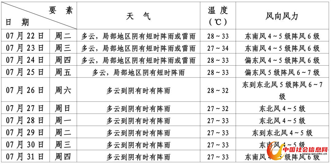 明天的天气依然是拷贝不走样,蓝天白云水晶天,偶尔会出现短时阵雨或雷雨,降水较为短暂、随机,不太适宜进行室外洗晒。气温跟今天相当,全天在27—34℃之间。东南风4—5级阵风6级,沿江沿海地区5级阵风6-7级,有风,所以早晚体感相对舒适,但由于湿度较大,相对湿度在90%~55%之间。午后闷热,还需适当防暑。